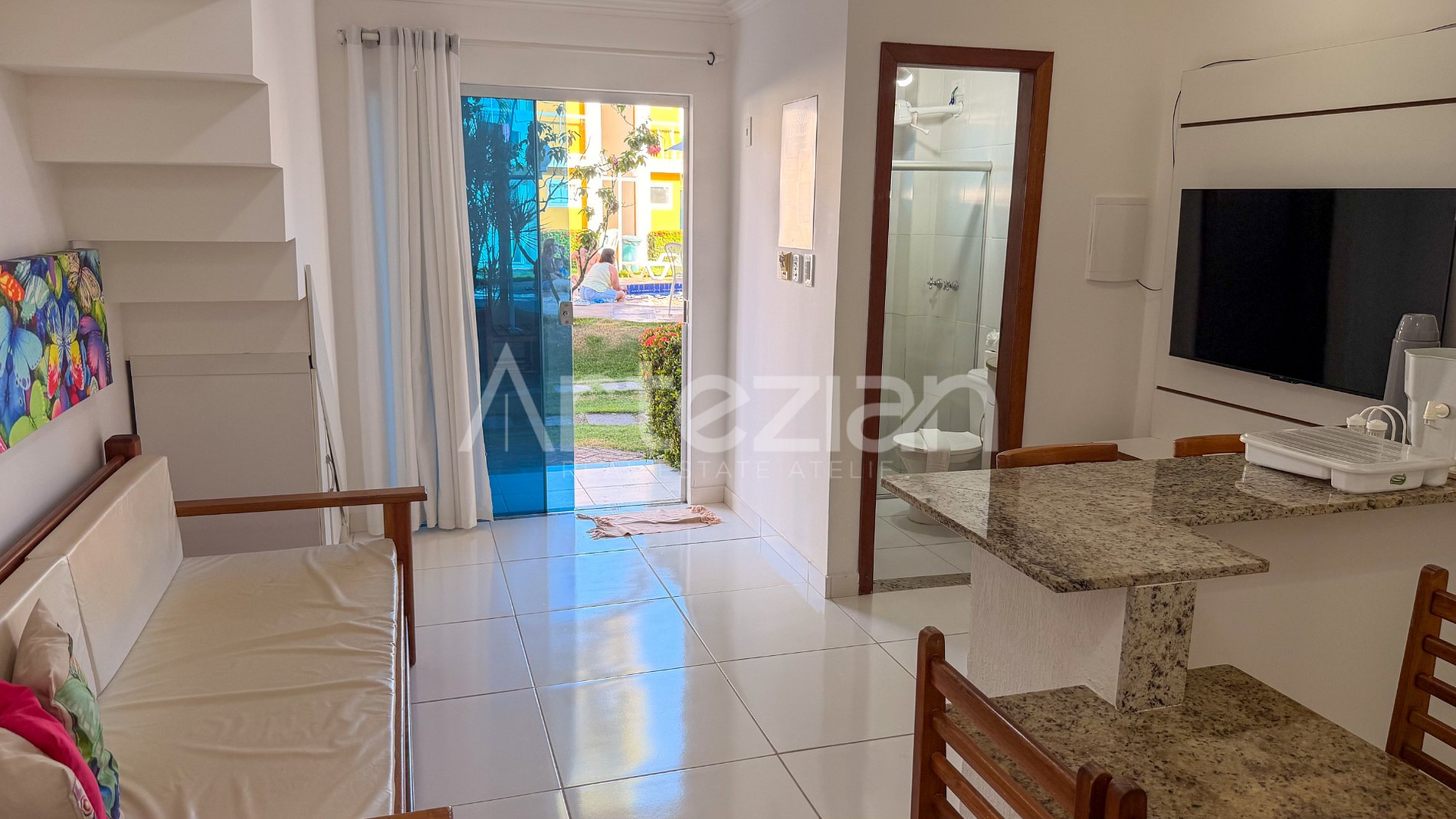 O apartamento da Mari fica no térreo, bem pertinho da piscina e das churrasqueiras do condomínio.